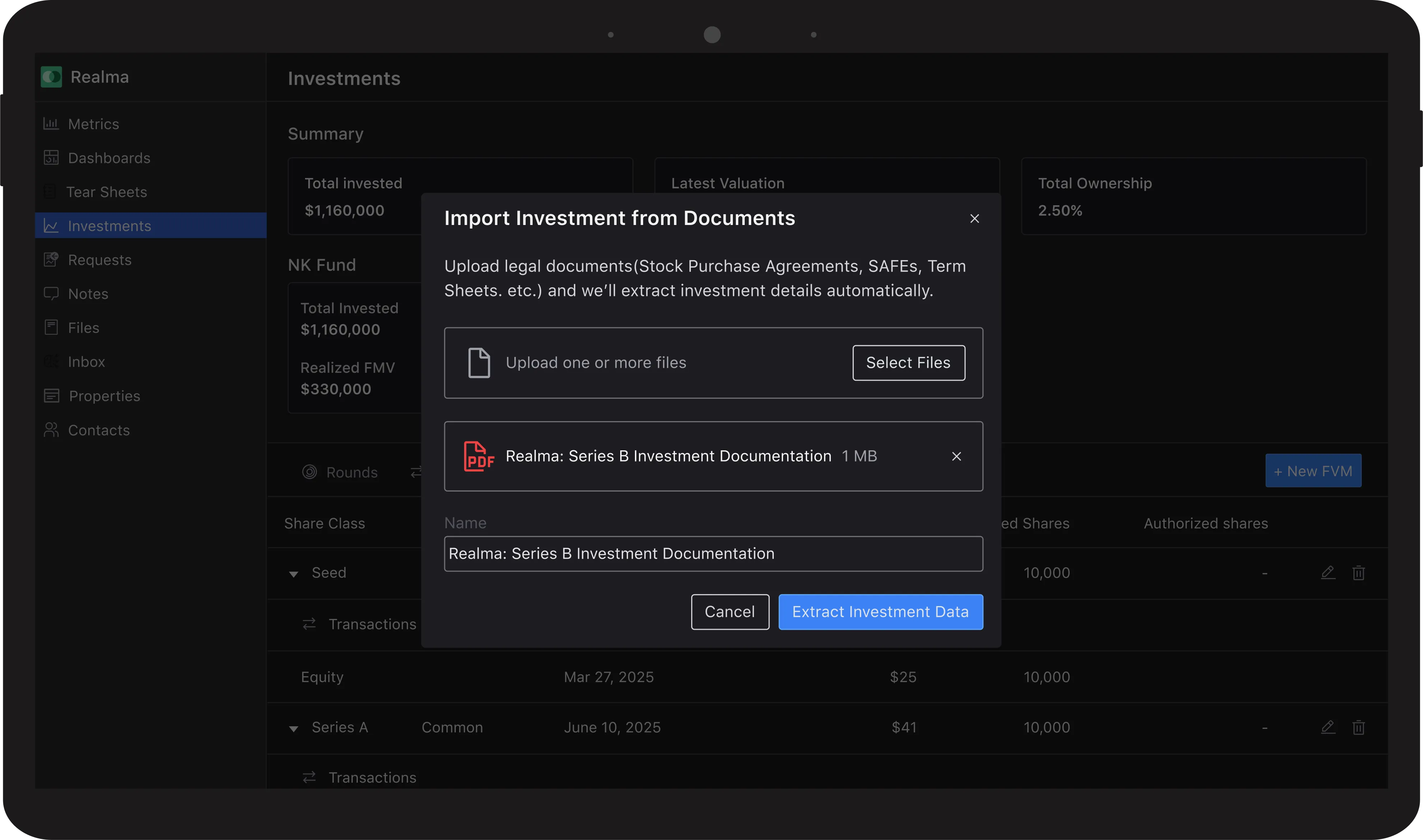 Drag in your deal documents and Visible AI Docs does the rest. Key data across transactions, rounds, and share classes is extracted and organized.