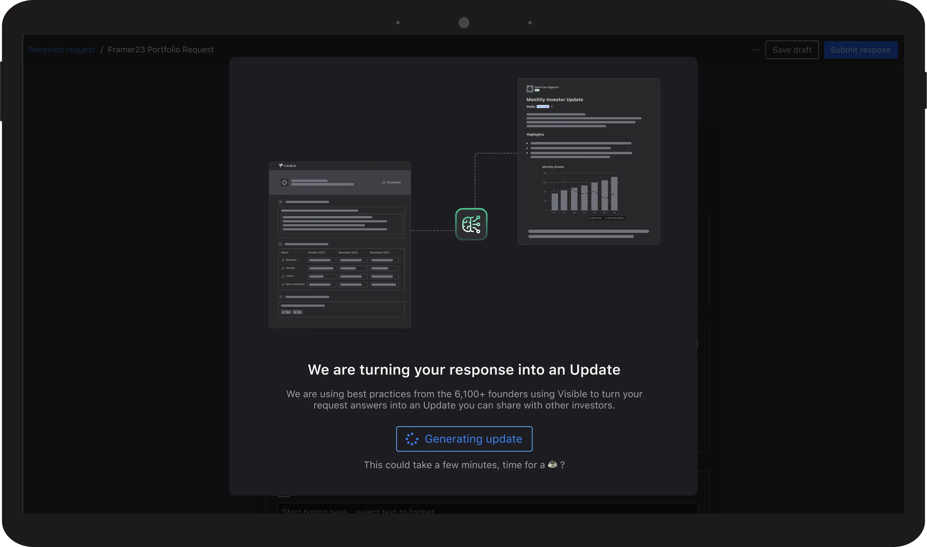 Visible AI generates an investor update using the data that founders submit through Visible Requests.