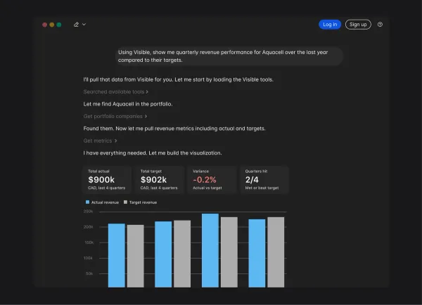 This is where the MCP server does something genuinely different. It combines two sources in a single query: the company’s live data from Visible - ARR, quarterly revenue, team size, fundraising stage - and publicly available information about comparable companies in the same sector and stage.