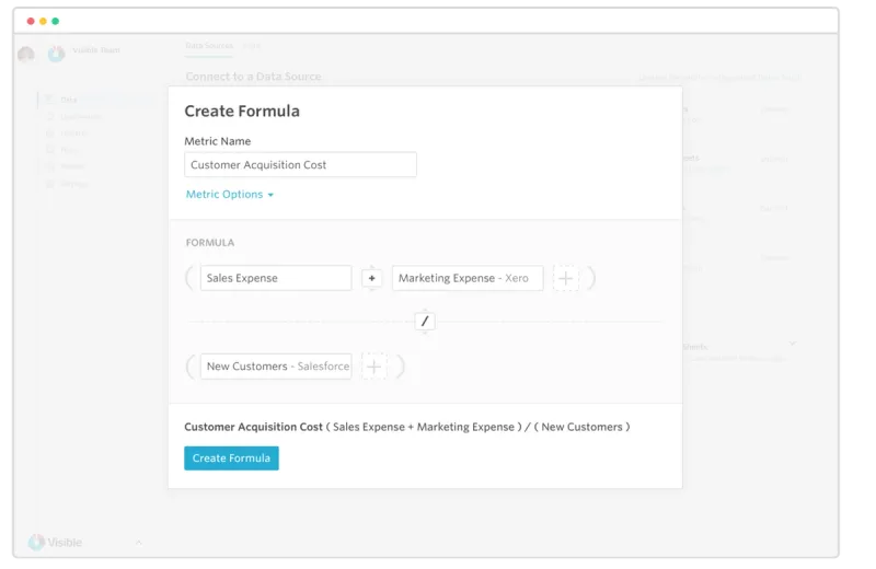 In the example above, we take calculate Customer Acquisition cost by taking Sales & Marketing Expenses from Xero and dividing by New Customers coming from Salesforce. Just one of infinite possibilities!
