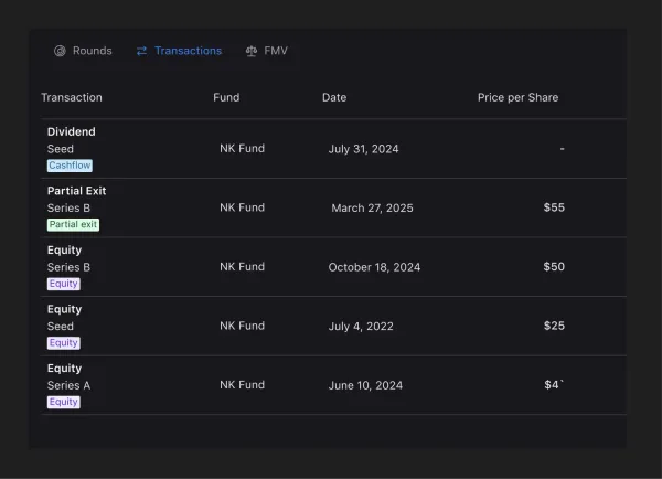 You can also create custom transactions that aren’t tied to a specific round. Whether you’re receiving a one-off dividend or logging a revenue-based return, the process is quick and flexible.
