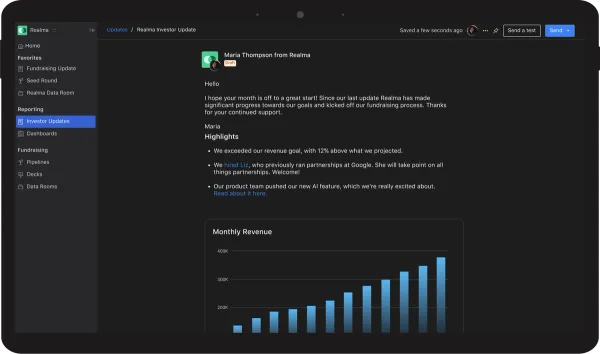 With Visible, founders can send updates directly via email, share data rooms and documents, and track which investors are engaging. Features like comments and threaded replies make it easier to collect feedback and keep conversations in one place.
