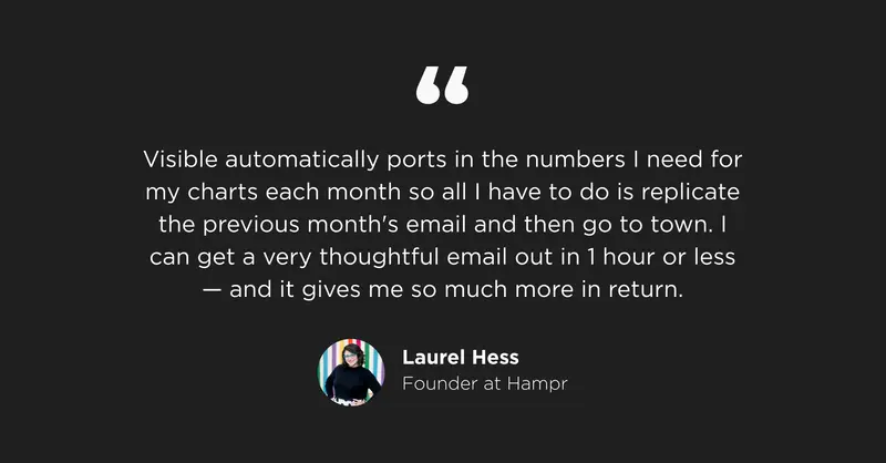 AND THAT'S IT! It gives a super high-level overview of where we are, what our focus is, and how we are unlocking new opportunities. It's skimmable, it's concise and it's easy for everyone. AND because I use Visible.vc, it automatically ports in the numbers I need for my charts each month so all I have to do is replicate the previous month's email and then go to town. I can get a very thoughtful email out in 1 hour or less - and it gives me so much more in return.”