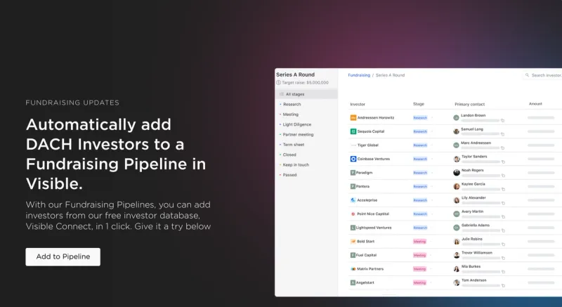 - Find investors at the top of your funnel with our free investor database, Visible Connect and find a filtered list of investors.