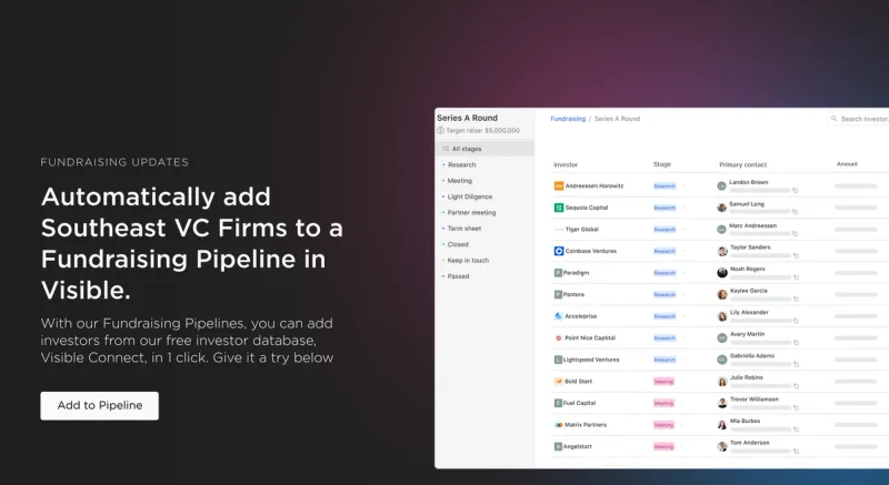 - Find investors at the top of your funnel with our free investor database, Visible Connect and find a filtered list of investors.