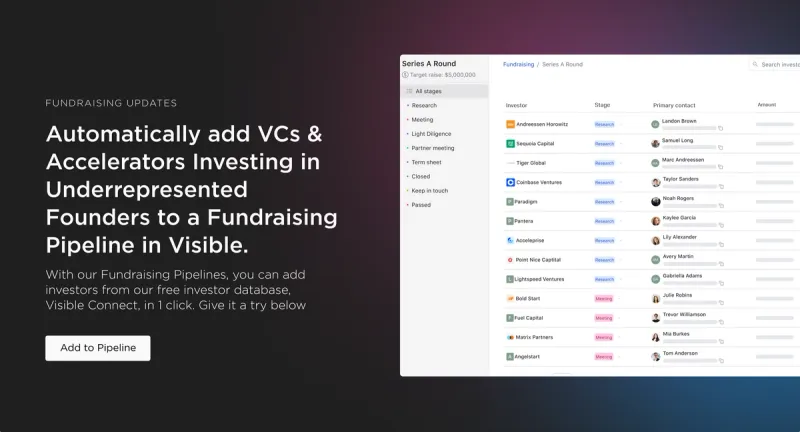 After finding the right Investor you can create a personalized investor database with Visible. Combine qualified investors from Visible Connect with your own investor lists to share targeted Updates, decks, and dashboards. Start your free trial here.