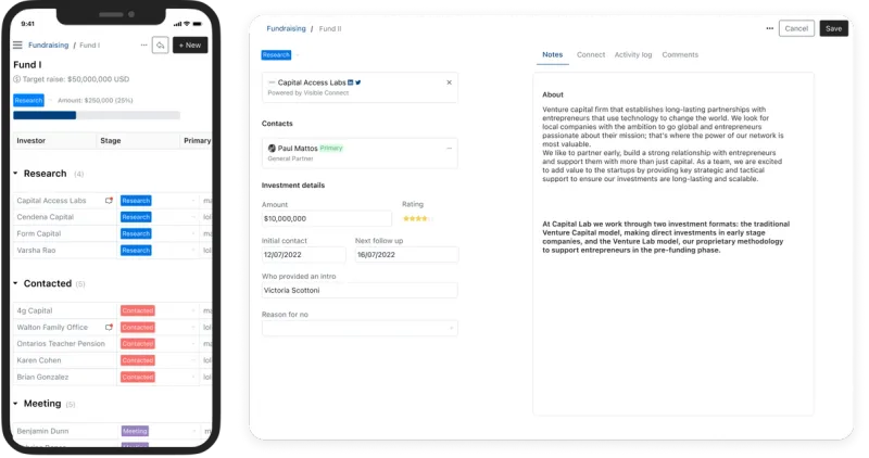 We’ve covered how to find LPs in general and which types of LPs at a high level might make sense for your fund. These potential investors should be considered your ‘top of funnel’ LPs and you should keep track of them in the first stage of your fundraising pipeline. Learn how to build a fundraising pipeline in Visible here.