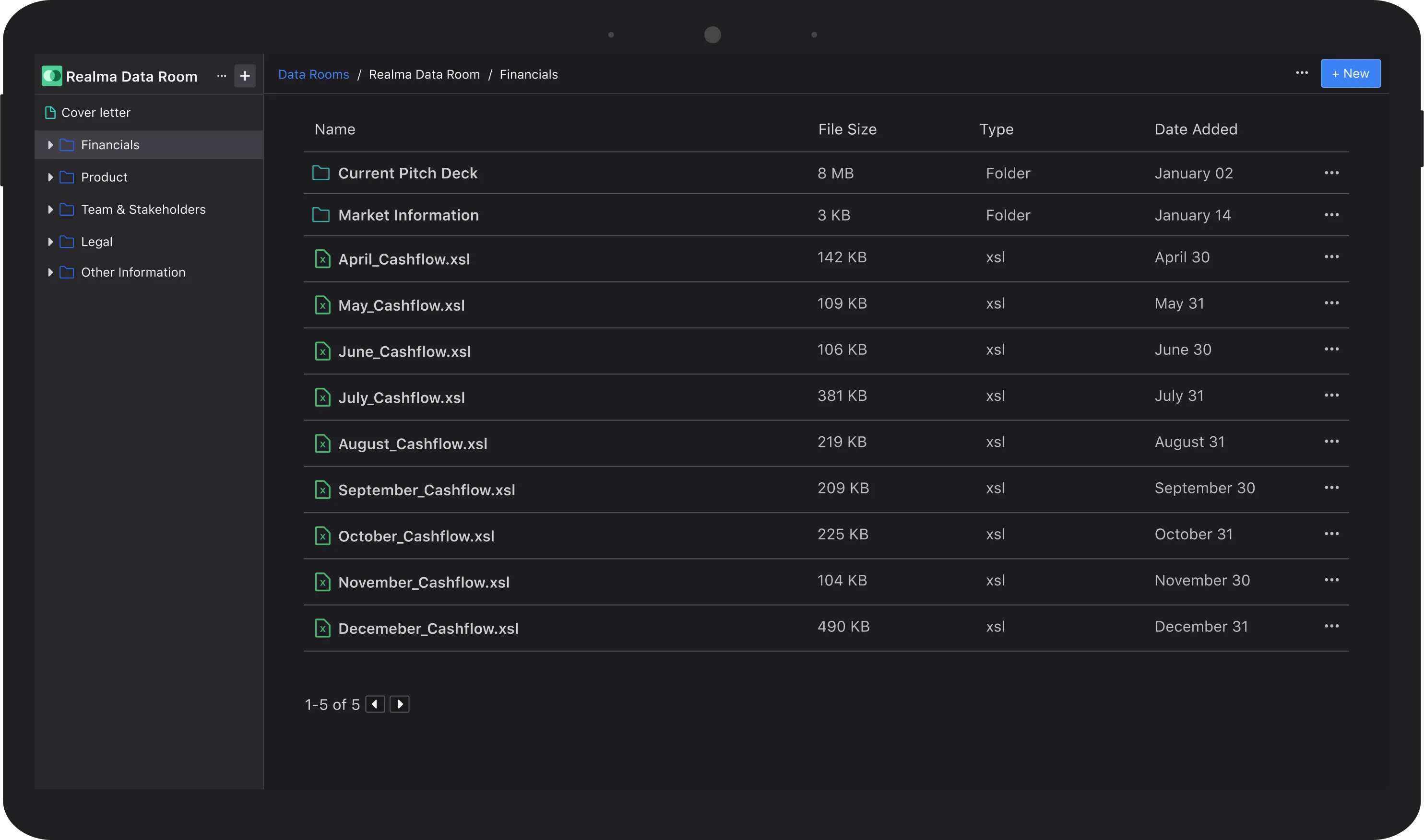 The content of your capital raising data room will depend on your business. However, we do see a few common folders across most data rooms. The most common data room folders include Legal & Corporate Docs, Financials, Team & Stakeholders, Cap Table, and Market Data. Learn more about common data room folders.