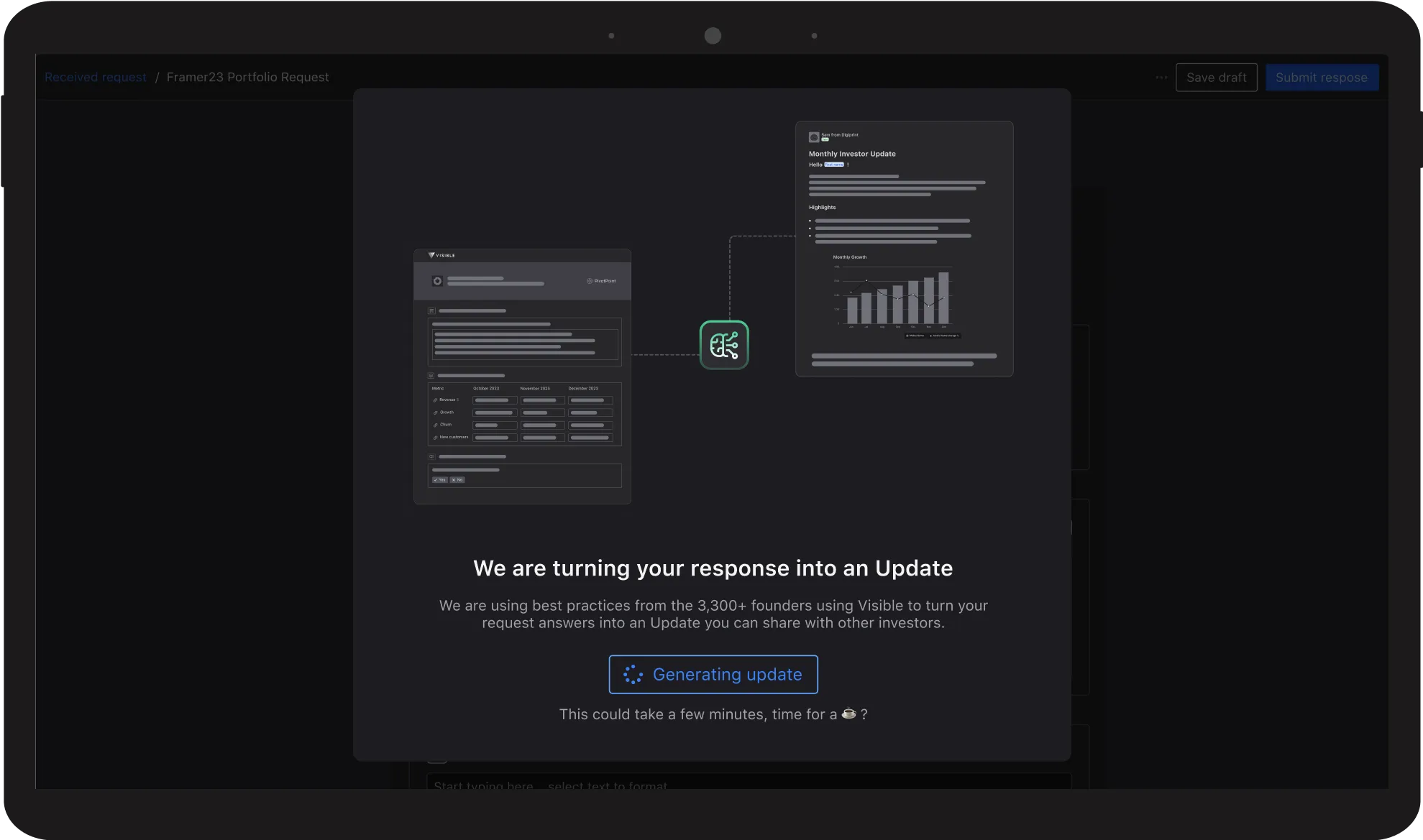 Visible AI generates an investor update using the data that founders submit through Visible Requests.
