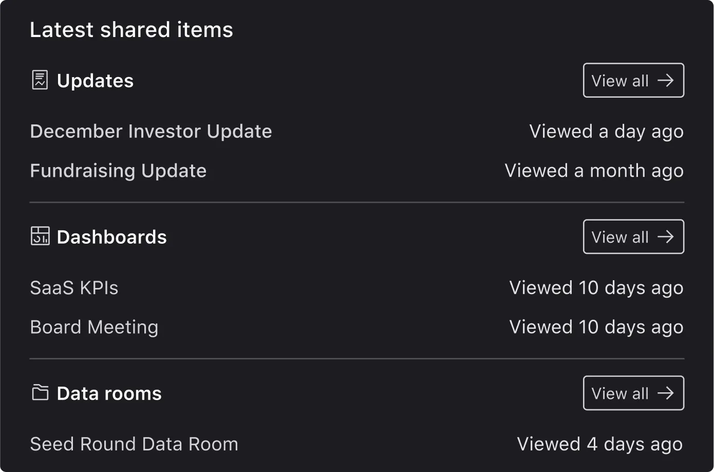 Share your pitch deck, data room, and updates from one place. Use our