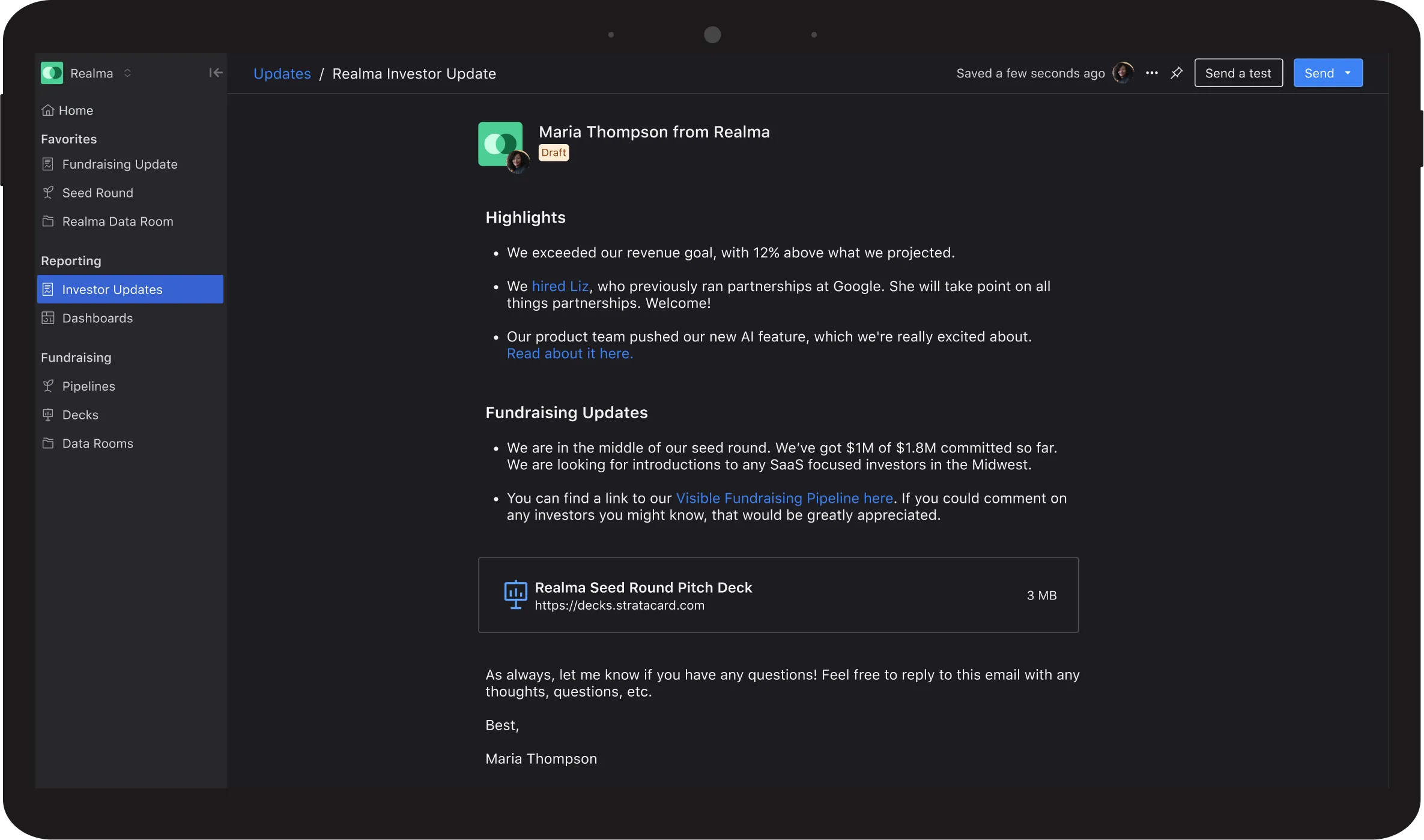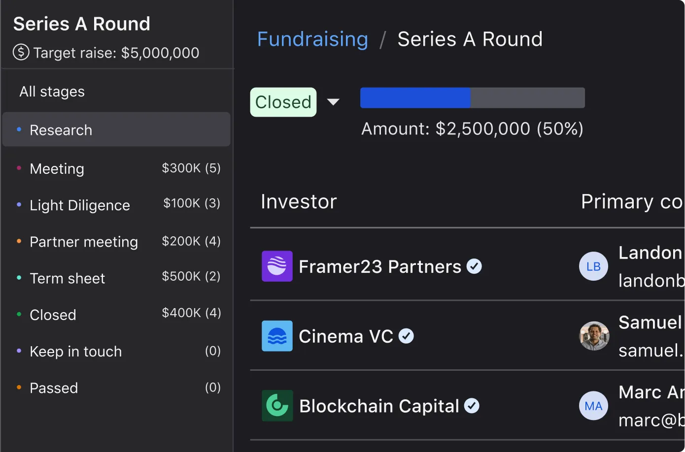 Add investors to your fundraising pipeline to track conversations and engagement with potential investors.