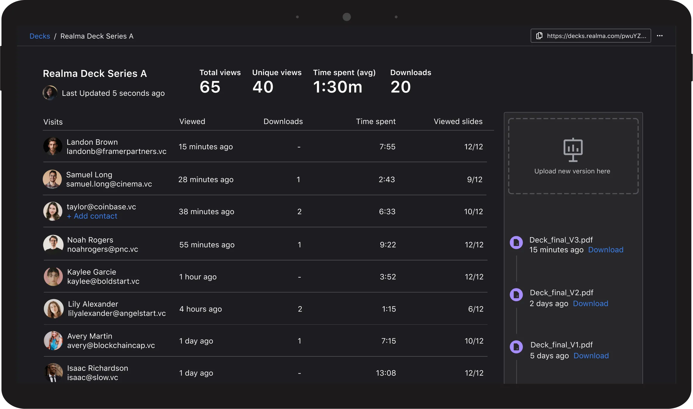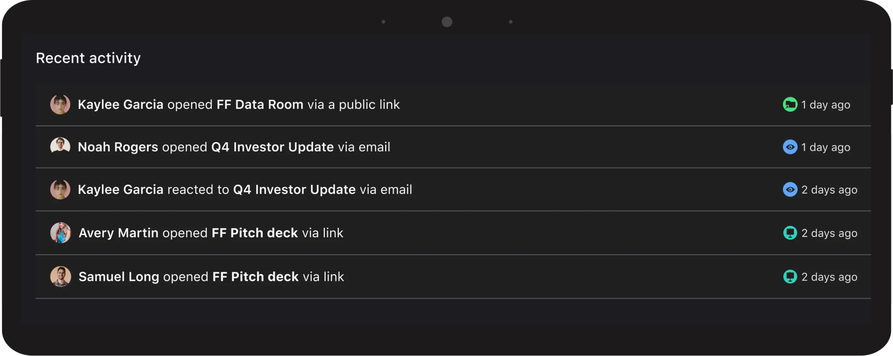 Understand how potential investors are engaging with your Visible fundraising materials in one view.
