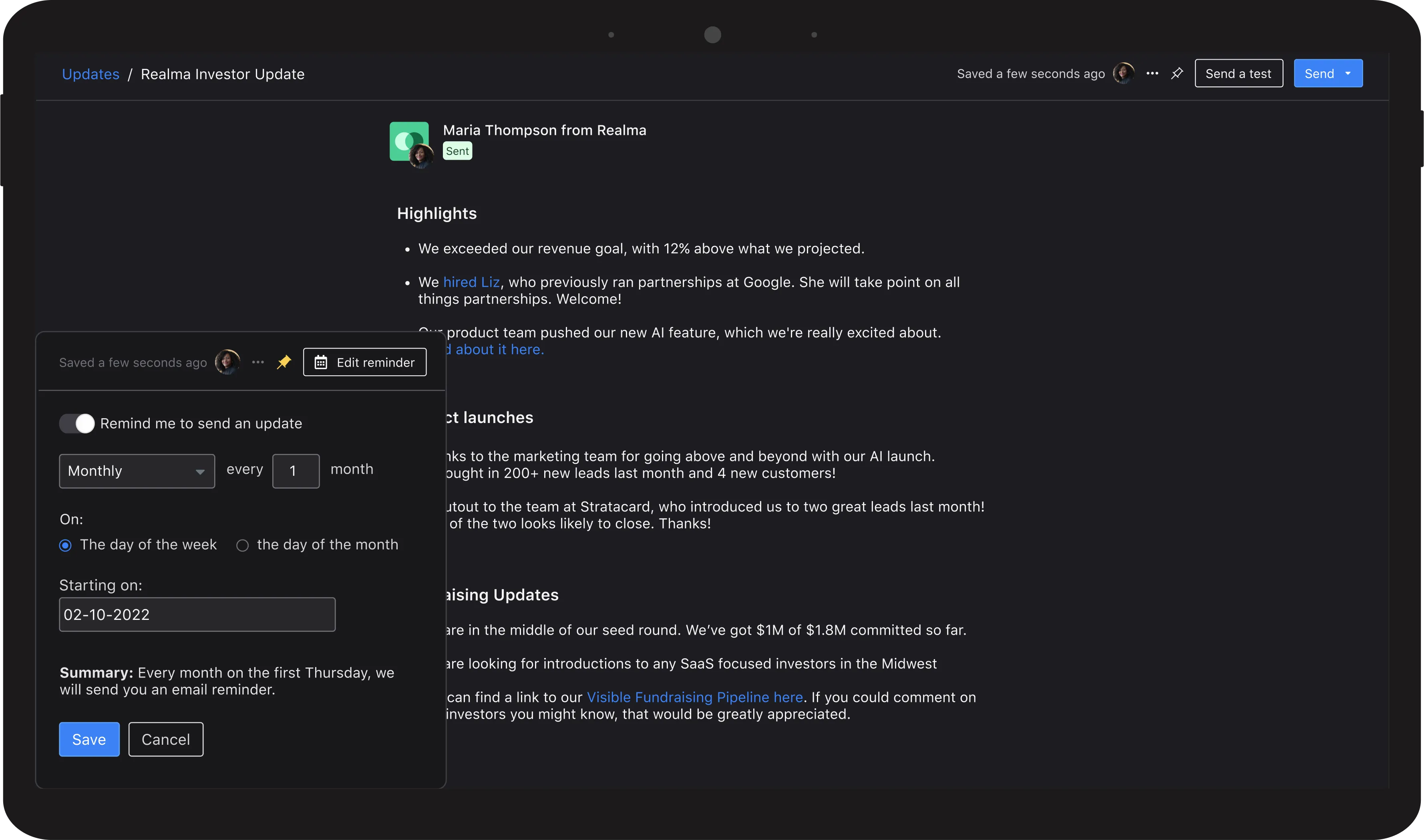 Send regular investor updates to build trust with existing and potential investors.