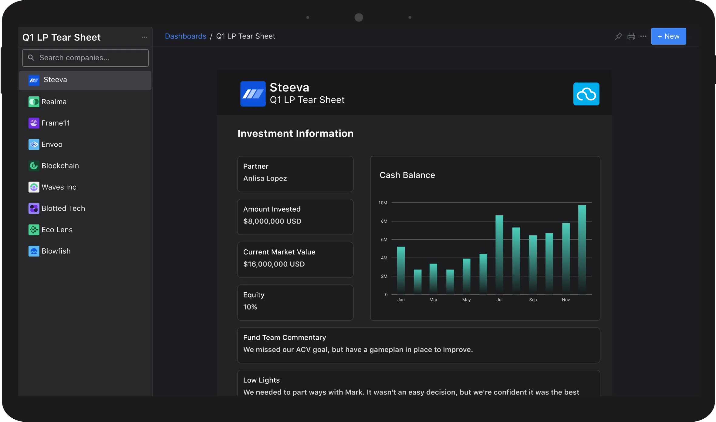 "I can't praise the Visible team enough! We can push financial requests to our portfolio companies, directly access metrics & responses in the platform, and analyze our data to compare individual & portfolio-wide performance through dashboards."