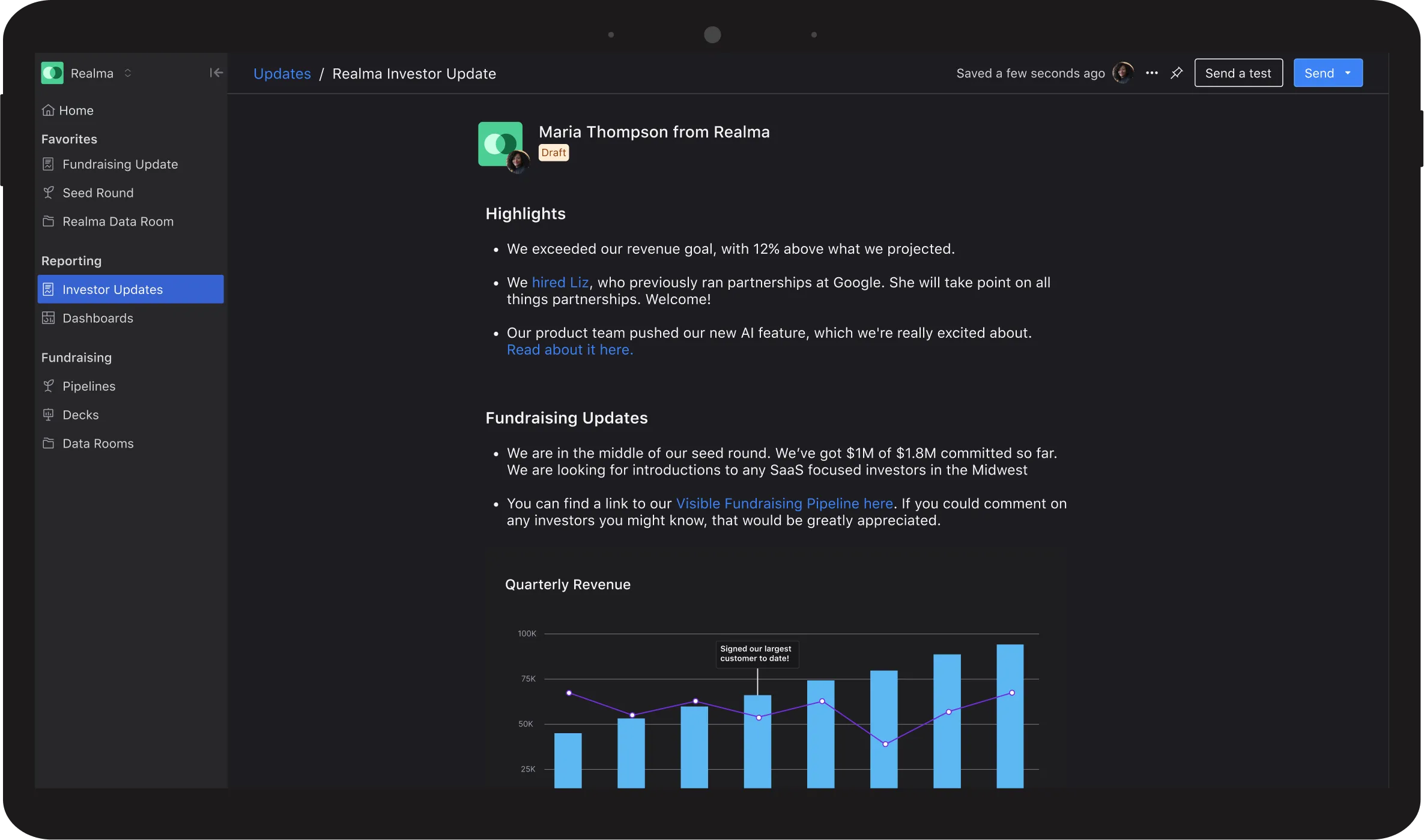 Deliver timely, data-backed updates to cultivate trust and credibility with your investors.