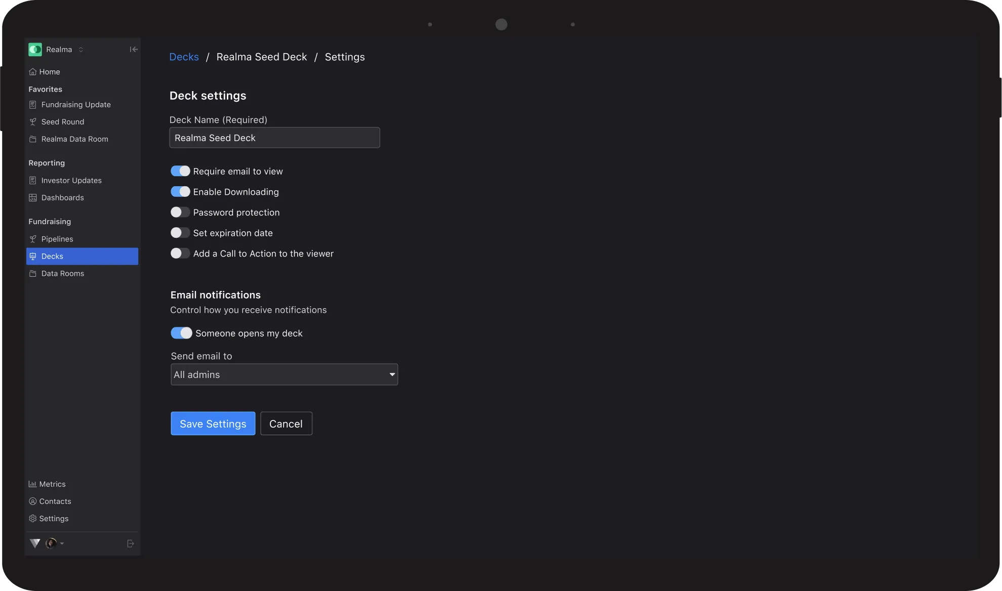 Manage your deck-sharing settings and upload your latest deck just once to keep all your investors informed throughout your fundraising journey.