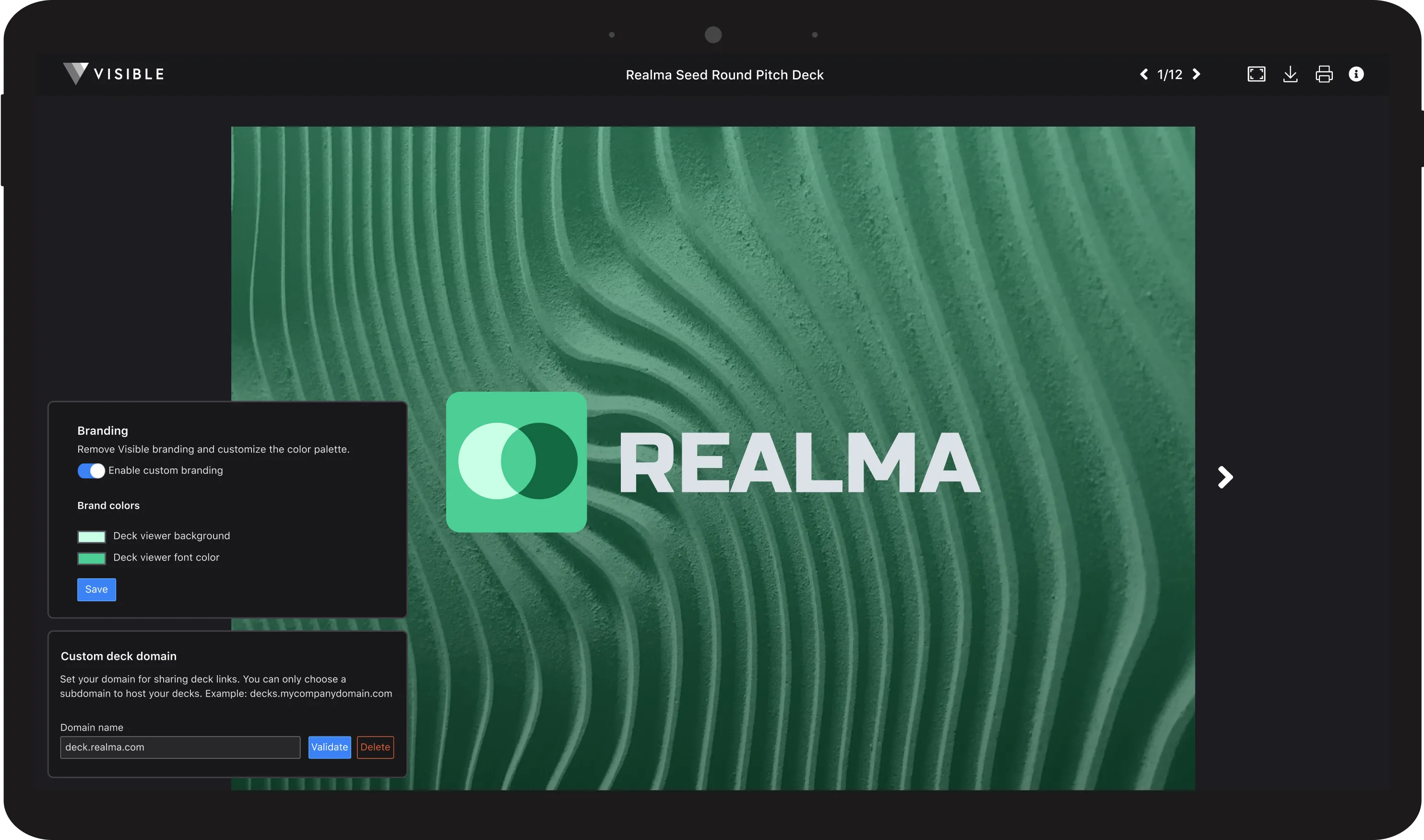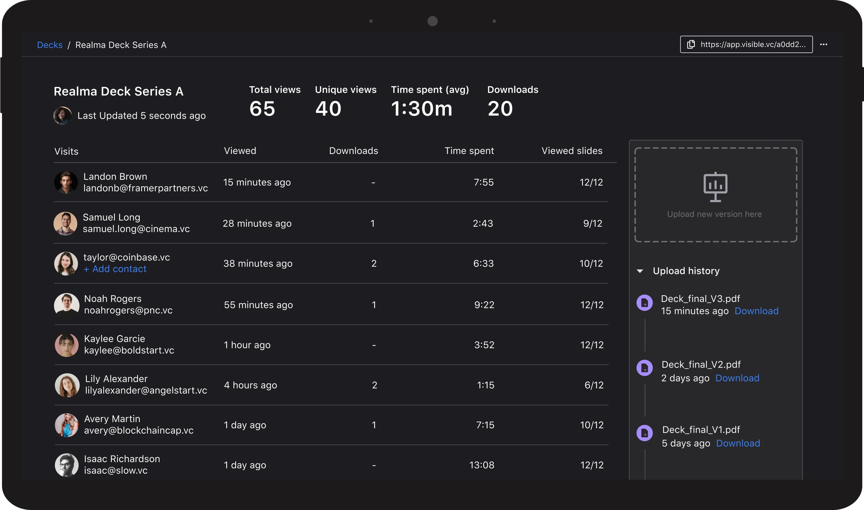 Upload your deck, tailor it to your brand, share it securely, and understand engagement.