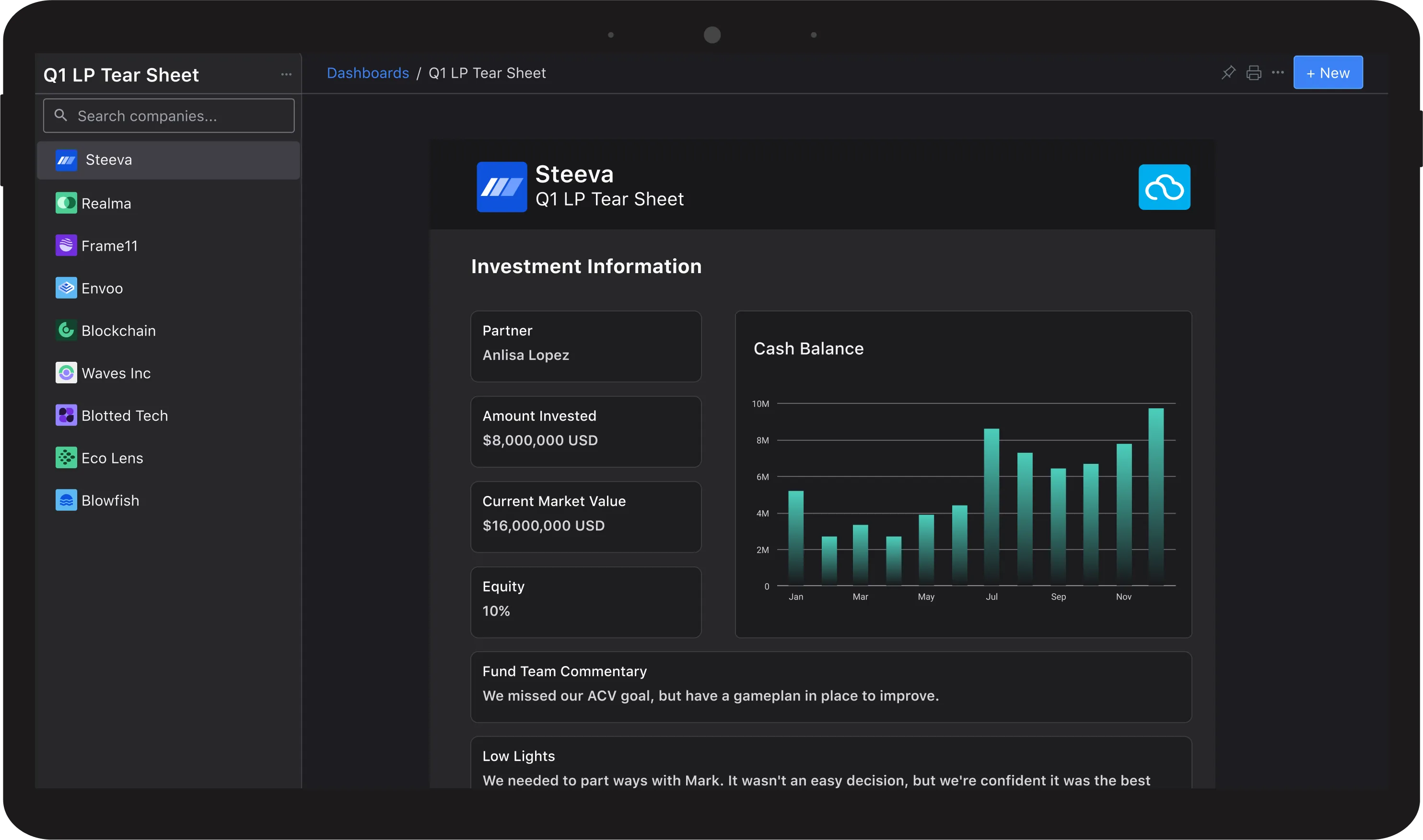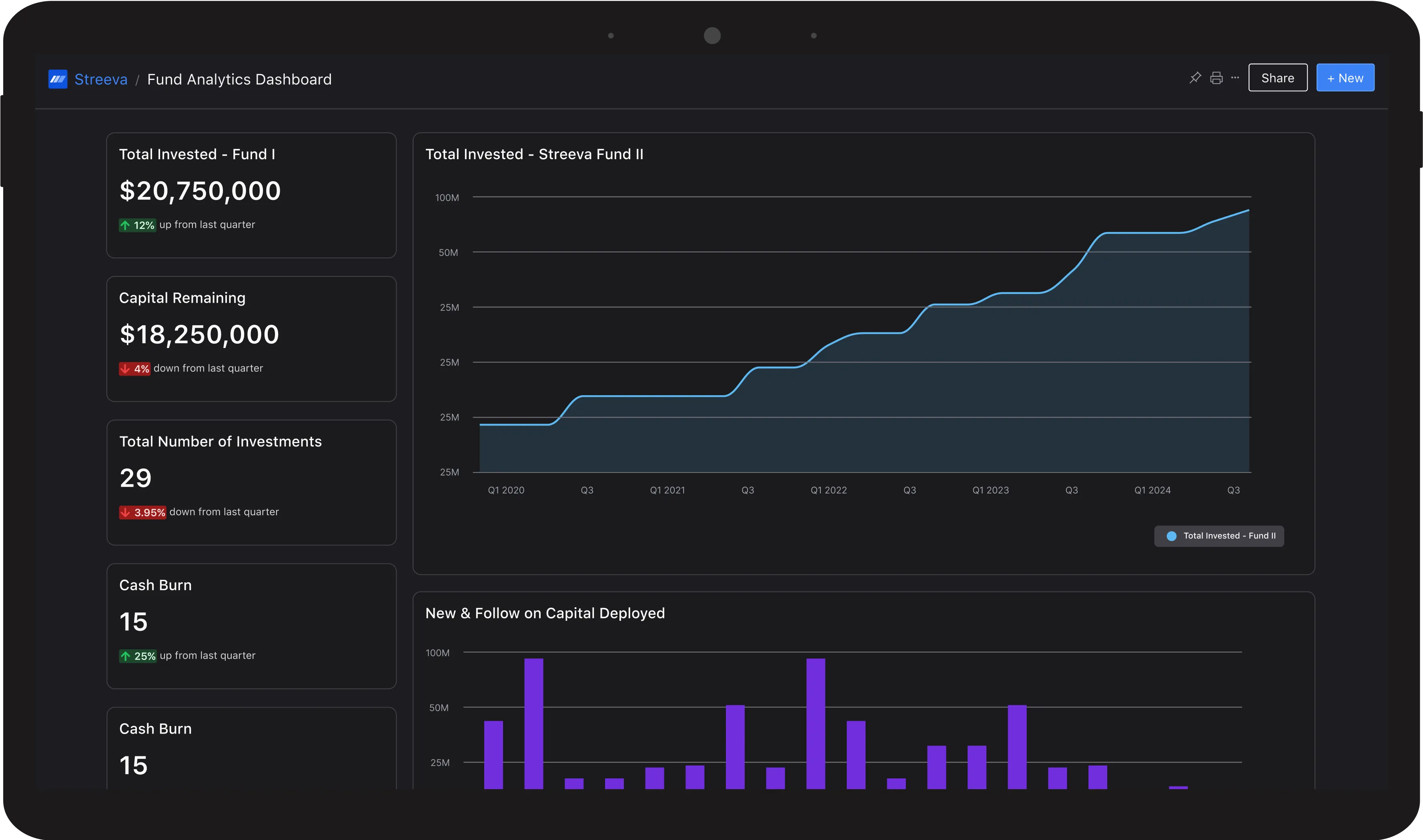 Design your ideal fund performance dashboard to share with your team and investors.