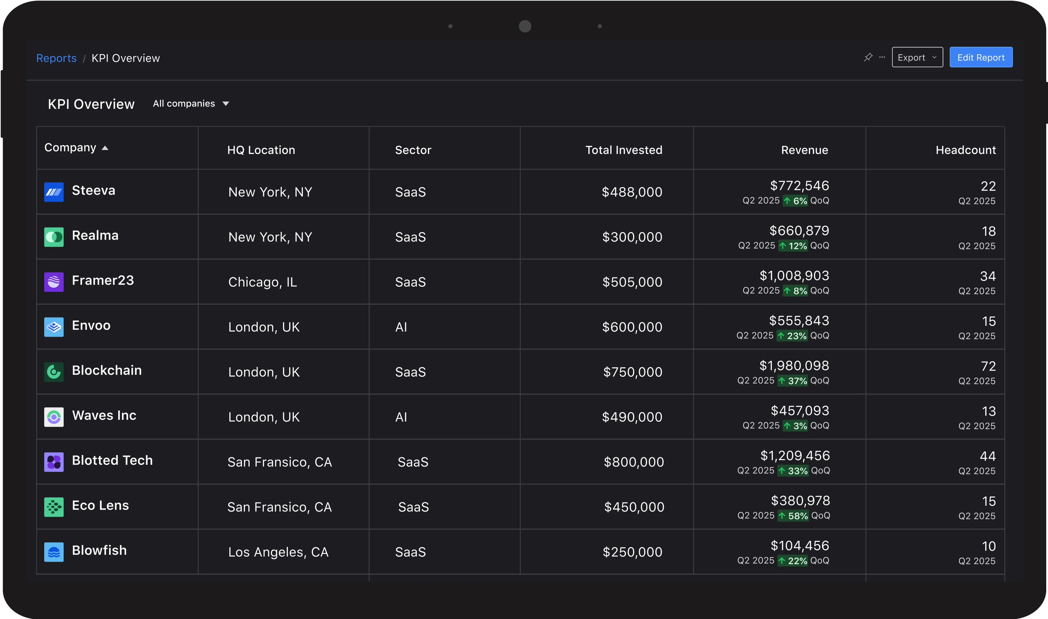 "I can't praise the Visible team enough! We can push financial requests to our portfolio companies, directly access metrics & responses in the platform, and analyze our data to compare individual & portfolio-wide performance through dashboards."